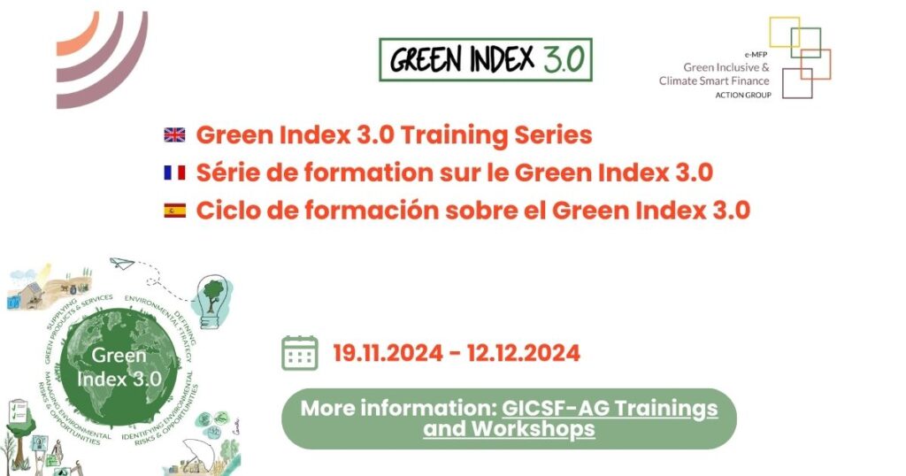 El Grupo de Acción European Microfinance Platform, e-MFP para unas Finanzas Verdes, Inclusivas y Climáticamente Inteligentes, se complace en invitar a todos los profesionales que trabajan en el ámbito de las #finanzas #verdes #inclusivas a participar en un ciclo de #cuatro #capacitaciones #gratuitas en #línea sobre el marco del Green Index 3.0.