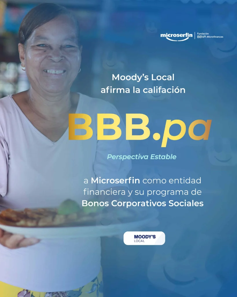 Panamá, 20 de febrero de 2025 – Microserfin, entidad de la Fundación Microfinanzas BBVA (FMBBVA), reafirma su solidez y liderazgo en el sector de las microfinanzas en Panamá al obtener, por segunda ocasión consecutiva, la calificación BBB.pa con perspectiva estable por parte de la agencia calificadora Moody’s Local Panamá, evaluación que abarca tanto a la entidad como a su Programa Rotativo de Bonos Corporativos Sociales, esta última por primera vez luego de su ingreso a la Bolsa Latinoamericana de Valores (Latinex) en abril del año pasado, reflejando la confianza del mercado en su modelo de negocio y su capacidad de gestión financiera.
